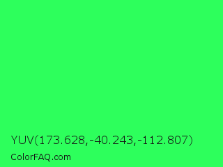 YUV 173.628,-40.243,-112.807 Color is a normal green color and the nearest color is Malachite #0bda51. Hex code #2dff5c and RGB value is rgb(45,255,92). In RGB color space, this color is composed of 18% red, 100% green, 36% blue, In CMYK color space, this color is composed of 82% cyan, 0% magenta, 64% yellow , 0% black , In HSL color space, this color has a hue angle of 133° , 100% saturation and 59% lightness.