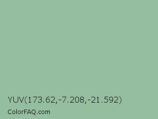 YUV 173.62,-7.208,-21.592 Color is a light green color and the nearest color is Eton Blue #96c8a2. Hex code #95bd9f and RGB value is rgb(149,189,159). In RGB color space, this color is composed of 58% red, 74% green, 62% blue, In CMYK color space, this color is composed of 21% cyan, 0% magenta, 16% yellow , 26% black , In HSL color space, this color has a hue angle of 135° , 23% saturation and 66% lightness.
