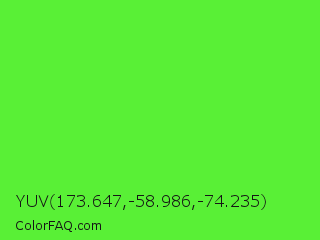 YUV 173.647,-58.986,-74.235 Color is a normal green color and the nearest color is Neon Green #39ff14. Hex code #59f036 and RGB value is rgb(89,240,54). In RGB color space, this color is composed of 35% red, 94% green, 21% blue, In CMYK color space, this color is composed of 63% cyan, 0% magenta, 78% yellow , 6% black , In HSL color space, this color has a hue angle of 109° , 86% saturation and 58% lightness.