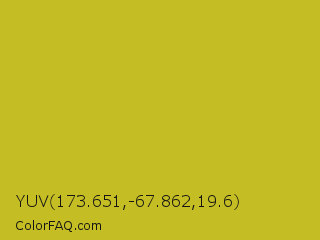 YUV 173.651,-67.862,19.6 Color is a normal yellow color and the nearest color is Key Lime Pie #bfc921. Hex code #c4bd24 and RGB value is rgb(196,189,36). In RGB color space, this color is composed of 77% red, 74% green, 14% blue, In CMYK color space, this color is composed of 0% cyan, 4% magenta, 82% yellow , 23% black , In HSL color space, this color has a hue angle of 57° , 69% saturation and 45% lightness.