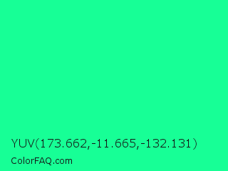 YUV 173.662,-11.665,-132.131 Color is a normal green color and the nearest color is Medium Spring Green #00fa9a. Hex code #17ff96 and RGB value is rgb(23,255,150). In RGB color space, this color is composed of 9% red, 100% green, 59% blue, In CMYK color space, this color is composed of 91% cyan, 0% magenta, 41% yellow , 0% black , In HSL color space, this color has a hue angle of 153° , 100% saturation and 55% lightness.