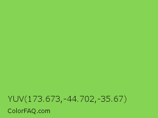 YUV 173.673,-44.702,-35.67 Color is a normal green color and the nearest color is Kiwi #8ee53f. Hex code #85d453 and RGB value is rgb(133,212,83). In RGB color space, this color is composed of 52% red, 83% green, 33% blue, In CMYK color space, this color is composed of 37% cyan, 0% magenta, 61% yellow , 17% black , In HSL color space, this color has a hue angle of 97° , 60% saturation and 58% lightness.