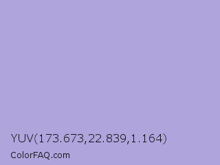 YUV 173.673,22.839,1.164 Color is a light indigo color and the nearest color is Cold Purple #aba0d9. Hex code #afa4dc and RGB value is rgb(175,164,220). In RGB color space, this color is composed of 69% red, 64% green, 86% blue, In CMYK color space, this color is composed of 20% cyan, 25% magenta, 0% yellow , 14% black , In HSL color space, this color has a hue angle of 252° , 44% saturation and 75% lightness.