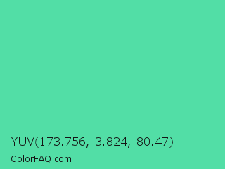 YUV 173.756,-3.824,-80.47 Color is a normal green color and the nearest color is Eucalyptus #44d7a8. Hex code #52dea6 and RGB value is rgb(82,222,166). In RGB color space, this color is composed of 32% red, 87% green, 65% blue, In CMYK color space, this color is composed of 63% cyan, 0% magenta, 25% yellow , 13% black , In HSL color space, this color has a hue angle of 156° , 68% saturation and 60% lightness.