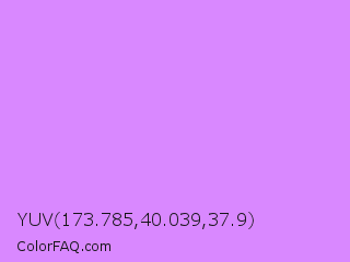 YUV 173.785,40.039,37.9 Color is a light purple color and the nearest color is Bright Lilac #d891ef. Hex code #d988ff and RGB value is rgb(217,136,255). In RGB color space, this color is composed of 85% red, 53% green, 100% blue, In CMYK color space, this color is composed of 15% cyan, 47% magenta, 0% yellow , 0% black , In HSL color space, this color has a hue angle of 281° , 100% saturation and 77% lightness.