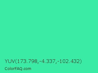 YUV 173.798,-4.337,-102.432 Color is a normal green color and the nearest color is Eucalyptus #44d7a8. Hex code #39eba5 and RGB value is rgb(57,235,165). In RGB color space, this color is composed of 22% red, 92% green, 65% blue, In CMYK color space, this color is composed of 76% cyan, 0% magenta, 30% yellow , 8% black , In HSL color space, this color has a hue angle of 156° , 82% saturation and 57% lightness.