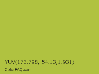 YUV 173.798,-54.13,1.931 Color is a normal yellow color and the nearest color is Android Green #a4c639. Hex code #b0c240 and RGB value is rgb(176,194,64). In RGB color space, this color is composed of 69% red, 76% green, 25% blue, In CMYK color space, this color is composed of 9% cyan, 0% magenta, 67% yellow , 24% black , In HSL color space, this color has a hue angle of 68° , 52% saturation and 51% lightness.