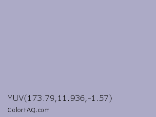 YUV 173.79,11.936,-1.57 Color is a light indigo color and the nearest color is Logan #aaa9cd. Hex code #acaac6 and RGB value is rgb(172,170,198). In RGB color space, this color is composed of 67% red, 67% green, 78% blue, In CMYK color space, this color is composed of 13% cyan, 14% magenta, 0% yellow , 22% black , In HSL color space, this color has a hue angle of 244° , 20% saturation and 72% lightness.