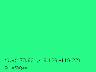YUV 173.801,-19.129,-118.22 Color is a normal green color and the nearest color is Spring Green #00ff7f. Hex code #27fa87 and RGB value is rgb(39,250,135). In RGB color space, this color is composed of 15% red, 98% green, 53% blue, In CMYK color space, this color is composed of 84% cyan, 0% magenta, 46% yellow , 2% black , In HSL color space, this color has a hue angle of 147° , 95% saturation and 57% lightness.