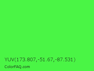 YUV 173.807,-51.67,-87.531 Color is a light green color and the nearest color is Screamin Green #66ff66. Hex code #4af545 and RGB value is rgb(74,245,69). In RGB color space, this color is composed of 29% red, 96% green, 27% blue, In CMYK color space, this color is composed of 70% cyan, 0% magenta, 72% yellow , 4% black , In HSL color space, this color has a hue angle of 118° , 90% saturation and 62% lightness.
