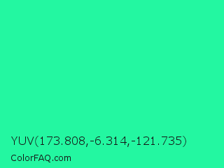 YUV 173.808,-6.314,-121.735 Color is a normal green color and the nearest color is Medium Spring Green #00fa9a. Hex code #23f7a1 and RGB value is rgb(35,247,161). In RGB color space, this color is composed of 14% red, 97% green, 63% blue, In CMYK color space, this color is composed of 86% cyan, 0% magenta, 35% yellow , 3% black , In HSL color space, this color has a hue angle of 156° , 93% saturation and 55% lightness.