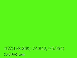 YUV 173.809,-74.842,-75.254 Color is a normal green color and the nearest color is Bright Green #66ff00. Hex code #58f716 and RGB value is rgb(88,247,22). In RGB color space, this color is composed of 35% red, 97% green, 9% blue, In CMYK color space, this color is composed of 64% cyan, 0% magenta, 91% yellow , 3% black , In HSL color space, this color has a hue angle of 102° , 93% saturation and 53% lightness.