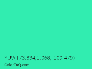 YUV 173.834,1.068,-109.479 Color is a normal green color and the nearest color is Eucalyptus #44d7a8. Hex code #31edb0 and RGB value is rgb(49,237,176). In RGB color space, this color is composed of 19% red, 93% green, 69% blue, In CMYK color space, this color is composed of 79% cyan, 0% magenta, 26% yellow , 7% black , In HSL color space, this color has a hue angle of 161° , 84% saturation and 56% lightness.
