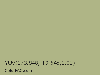 YUV 173.848,-19.645,1.01 Color is a light yellow color and the nearest color is Swamp Green #acb78e. Hex code #afb586 and RGB value is rgb(175,181,134). In RGB color space, this color is composed of 69% red, 71% green, 53% blue, In CMYK color space, this color is composed of 3% cyan, 0% magenta, 26% yellow , 29% black , In HSL color space, this color has a hue angle of 68° , 24% saturation and 62% lightness.
