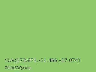 YUV 173.871,-31.488,-27.074 Color is a light green color and the nearest color is Pistachio #93c572. Hex code #8fca6e and RGB value is rgb(143,202,110). In RGB color space, this color is composed of 56% red, 79% green, 43% blue, In CMYK color space, this color is composed of 29% cyan, 0% magenta, 46% yellow , 21% black , In HSL color space, this color has a hue angle of 98° , 46% saturation and 61% lightness.
