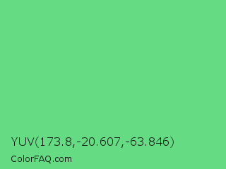 YUV 173.8,-20.607,-63.846 Color is a light green color and the nearest color is Very Light Malachite Green #64e986. Hex code #65db84 and RGB value is rgb(101,219,132). In RGB color space, this color is composed of 40% red, 86% green, 52% blue, In CMYK color space, this color is composed of 54% cyan, 0% magenta, 40% yellow , 14% black , In HSL color space, this color has a hue angle of 136° , 62% saturation and 63% lightness.