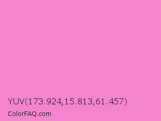 YUV 173.924,15.813,61.457 Color is a light magenta color and the nearest color is Princess Perfume #ff85cf. Hex code #f484ce and RGB value is rgb(244,132,206). In RGB color space, this color is composed of 96% red, 52% green, 81% blue, In CMYK color space, this color is composed of 0% cyan, 46% magenta, 16% yellow , 4% black , In HSL color space, this color has a hue angle of 320° , 84% saturation and 74% lightness.