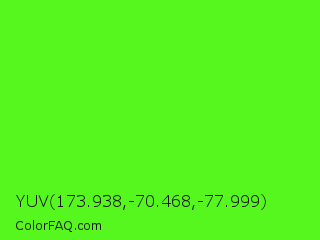 YUV 173.938,-70.468,-77.999 Color is a normal green color and the nearest color is Neon Green #39ff14. Hex code #55f71f and RGB value is rgb(85,247,31). In RGB color space, this color is composed of 33% red, 97% green, 12% blue, In CMYK color space, this color is composed of 66% cyan, 0% magenta, 87% yellow , 3% black , In HSL color space, this color has a hue angle of 105° , 93% saturation and 55% lightness.