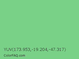 YUV 173.953,-19.204,-47.317 Color is a light green color and the nearest color is De York #7ac488. Hex code #78d187 and RGB value is rgb(120,209,135). In RGB color space, this color is composed of 47% red, 82% green, 53% blue, In CMYK color space, this color is composed of 43% cyan, 0% magenta, 35% yellow , 18% black , In HSL color space, this color has a hue angle of 130° , 49% saturation and 65% lightness.