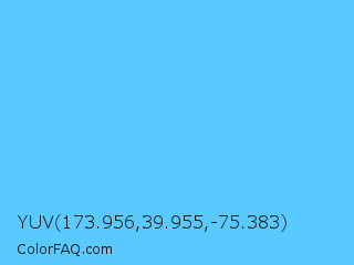 YUV 173.956,39.955,-75.383 Color is a light blue color and the nearest color is Maya Blue #73c2fb. Hex code #58caff and RGB value is rgb(88,202,255). In RGB color space, this color is composed of 35% red, 79% green, 100% blue, In CMYK color space, this color is composed of 65% cyan, 21% magenta, 0% yellow , 0% black , In HSL color space, this color has a hue angle of 199° , 100% saturation and 67% lightness.
