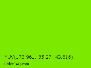 YUV 173.961,-85.27,-43.816 Color is a normal green color and the nearest color is Alien Armpit #84de02. Hex code #7ce901 and RGB value is rgb(124,233,1). In RGB color space, this color is composed of 49% red, 91% green, 0% blue, In CMYK color space, this color is composed of 47% cyan, 0% magenta, 100% yellow , 9% black , In HSL color space, this color has a hue angle of 88° , 99% saturation and 46% lightness.