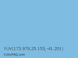 YUV 173.979,25.153,-41.201 Color is a light blue color and the nearest color is Aero #7cb9e8. Hex code #7fbce1 and RGB value is rgb(127,188,225). In RGB color space, this color is composed of 50% red, 74% green, 88% blue, In CMYK color space, this color is composed of 44% cyan, 16% magenta, 0% yellow , 12% black , In HSL color space, this color has a hue angle of 203° , 62% saturation and 69% lightness.