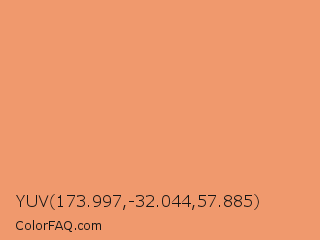 YUV 173.997,-32.044,57.885 Color is a light orange color and the nearest color is Apricot #eb9373. Hex code #f0996d and RGB value is rgb(240,153,109). In RGB color space, this color is composed of 94% red, 60% green, 43% blue, In CMYK color space, this color is composed of 0% cyan, 36% magenta, 55% yellow , 6% black , In HSL color space, this color has a hue angle of 20° , 81% saturation and 68% lightness.