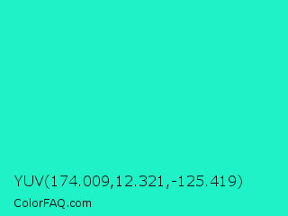YUV 174.009,12.321,-125.419 Color is a normal cyan color and the nearest color is Turquoise PWG #30d5c8. Hex code #1ff2c7 and RGB value is rgb(31,242,199). In RGB color space, this color is composed of 12% red, 95% green, 78% blue, In CMYK color space, this color is composed of 87% cyan, 0% magenta, 18% yellow , 5% black , In HSL color space, this color has a hue angle of 168° , 89% saturation and 54% lightness.