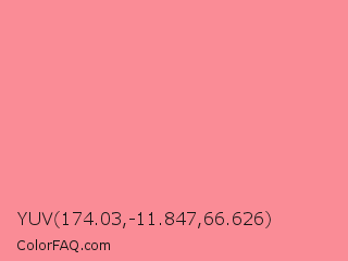 YUV 174.03,-11.847,66.626 Color is a light red color and the nearest color is Tulip #ff878d. Hex code #fa8c96 and RGB value is rgb(250,140,150). In RGB color space, this color is composed of 98% red, 55% green, 59% blue, In CMYK color space, this color is composed of 0% cyan, 44% magenta, 40% yellow , 2% black , In HSL color space, this color has a hue angle of 355° , 92% saturation and 76% lightness.