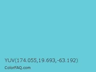 YUV 174.055,19.693,-63.192 Color is a light cyan color and the nearest color is Viking #64ccdb. Hex code #66cbd6 and RGB value is rgb(102,203,214). In RGB color space, this color is composed of 40% red, 80% green, 84% blue, In CMYK color space, this color is composed of 52% cyan, 5% magenta, 0% yellow , 16% black , In HSL color space, this color has a hue angle of 186° , 58% saturation and 62% lightness.
