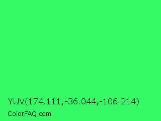 YUV 174.111,-36.044,-106.214 Color is a normal green color and the nearest color is UFO Green #3cd070. Hex code #35fa65 and RGB value is rgb(53,250,101). In RGB color space, this color is composed of 21% red, 98% green, 40% blue, In CMYK color space, this color is composed of 79% cyan, 0% magenta, 60% yellow , 2% black , In HSL color space, this color has a hue angle of 135° , 95% saturation and 59% lightness.