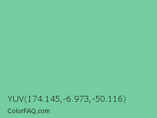 YUV 174.145,-6.973,-50.116 Color is a light green color and the nearest color is Medium Aquamarine #66ddaa. Hex code #75cea0 and RGB value is rgb(117,206,160). In RGB color space, this color is composed of 46% red, 81% green, 63% blue, In CMYK color space, this color is composed of 43% cyan, 0% magenta, 22% yellow , 19% black , In HSL color space, this color has a hue angle of 149° , 48% saturation and 63% lightness.