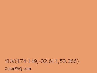 YUV 174.149,-32.611,53.366 Color is a light orange color and the nearest color is Apricot #eb9373. Hex code #eb9c6c and RGB value is rgb(235,156,108). In RGB color space, this color is composed of 92% red, 61% green, 42% blue, In CMYK color space, this color is composed of 0% cyan, 34% magenta, 54% yellow , 8% black , In HSL color space, this color has a hue angle of 23° , 76% saturation and 67% lightness.