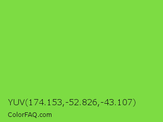 YUV 174.153,-52.826,-43.107 Color is a normal green color and the nearest color is Kiwi #8ee53f. Hex code #7ddc43 and RGB value is rgb(125,220,67). In RGB color space, this color is composed of 49% red, 86% green, 26% blue, In CMYK color space, this color is composed of 43% cyan, 0% magenta, 70% yellow , 14% black , In HSL color space, this color has a hue angle of 97° , 69% saturation and 56% lightness.