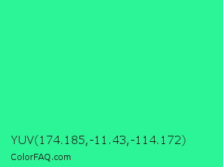 YUV 174.185,-11.43,-114.172 Color is a normal green color and the nearest color is Shamrock #33cc99. Hex code #2cf597 and RGB value is rgb(44,245,151). In RGB color space, this color is composed of 17% red, 96% green, 59% blue, In CMYK color space, this color is composed of 82% cyan, 0% magenta, 38% yellow , 4% black , In HSL color space, this color has a hue angle of 152° , 91% saturation and 57% lightness.