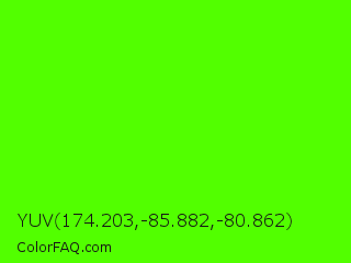YUV 174.203,-85.882,-80.862 Color is a normal green color and the nearest color is Chlorophyll Green #4aff00. Hex code #52ff00 and RGB value is rgb(82,255,-0). In RGB color space, this color is composed of 32% red, 100% green, 0% blue, In CMYK color space, this color is composed of 68% cyan, 0% magenta, 100% yellow , 0% black , In HSL color space, this color has a hue angle of 101° , 100% saturation and 50% lightness.