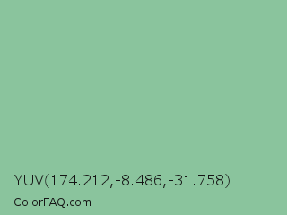 YUV 174.212,-8.486,-31.758 Color is a light green color and the nearest color is Eton Blue #96c8a2. Hex code #8ac49d and RGB value is rgb(138,196,157). In RGB color space, this color is composed of 54% red, 77% green, 62% blue, In CMYK color space, this color is composed of 30% cyan, 0% magenta, 20% yellow , 23% black , In HSL color space, this color has a hue angle of 140° , 33% saturation and 65% lightness.