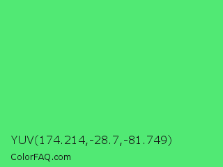YUV 174.214,-28.7,-81.749 Color is a light green color and the nearest color is Very Light Malachite Green #64e986. Hex code #51e974 and RGB value is rgb(81,233,116). In RGB color space, this color is composed of 32% red, 91% green, 45% blue, In CMYK color space, this color is composed of 65% cyan, 0% magenta, 50% yellow , 9% black , In HSL color space, this color has a hue angle of 134° , 78% saturation and 62% lightness.