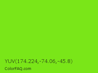 YUV 174.224,-74.06,-45.8 Color is a normal green color and the nearest color is Alien Armpit #84de02. Hex code #7ae618 and RGB value is rgb(122,230,24). In RGB color space, this color is composed of 48% red, 90% green, 9% blue, In CMYK color space, this color is composed of 47% cyan, 0% magenta, 90% yellow , 10% black , In HSL color space, this color has a hue angle of 91° , 81% saturation and 50% lightness.