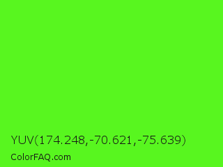 YUV 174.248,-70.621,-75.639 Color is a normal green color and the nearest color is Neon Green #39ff14. Hex code #58f61f and RGB value is rgb(88,246,31). In RGB color space, this color is composed of 35% red, 96% green, 12% blue, In CMYK color space, this color is composed of 64% cyan, 0% magenta, 87% yellow , 4% black , In HSL color space, this color has a hue angle of 104° , 92% saturation and 54% lightness.