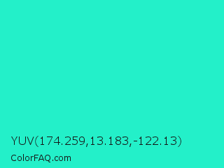 YUV 174.259,13.183,-122.13 Color is a normal cyan color and the nearest color is Turquoise PWG #30d5c8. Hex code #23f0c9 and RGB value is rgb(35,240,201). In RGB color space, this color is composed of 14% red, 94% green, 79% blue, In CMYK color space, this color is composed of 85% cyan, 0% magenta, 16% yellow , 6% black , In HSL color space, this color has a hue angle of 169° , 87% saturation and 54% lightness.