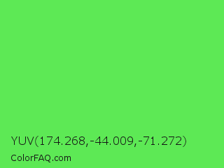 YUV 174.268,-44.009,-71.272 Color is a light green color and the nearest color is Screamin Green #66ff66. Hex code #5de955 and RGB value is rgb(93,233,85). In RGB color space, this color is composed of 36% red, 91% green, 33% blue, In CMYK color space, this color is composed of 60% cyan, 0% magenta, 64% yellow , 9% black , In HSL color space, this color has a hue angle of 117° , 77% saturation and 62% lightness.