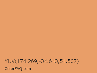 YUV 174.269,-34.643,51.507 Color is a light orange color and the nearest color is Sandy Brown #f4a460. Hex code #e99e68 and RGB value is rgb(233,158,104). In RGB color space, this color is composed of 91% red, 62% green, 41% blue, In CMYK color space, this color is composed of 0% cyan, 32% magenta, 55% yellow , 9% black , In HSL color space, this color has a hue angle of 25° , 75% saturation and 66% lightness.