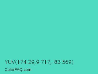 YUV 174.29,9.717,-83.569 Color is a normal cyan color and the nearest color is Medium Turquoise #48d1cc. Hex code #4fdbc2 and RGB value is rgb(79,219,194). In RGB color space, this color is composed of 31% red, 86% green, 76% blue, In CMYK color space, this color is composed of 64% cyan, 0% magenta, 11% yellow , 14% black , In HSL color space, this color has a hue angle of 169° , 66% saturation and 58% lightness.