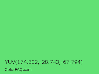 YUV 174.302,-28.743,-67.794 Color is a light green color and the nearest color is Very Light Malachite Green #64e986. Hex code #61e174 and RGB value is rgb(97,225,116). In RGB color space, this color is composed of 38% red, 88% green, 45% blue, In CMYK color space, this color is composed of 57% cyan, 0% magenta, 48% yellow , 12% black , In HSL color space, this color has a hue angle of 129° , 68% saturation and 63% lightness.
