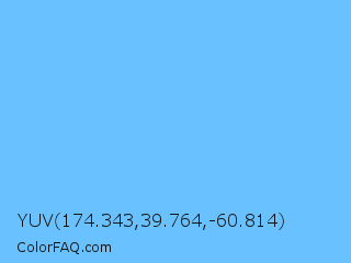 YUV 174.343,39.764,-60.814 Color is a light blue color and the nearest color is Maya Blue #73c2fb. Hex code #69c2ff and RGB value is rgb(105,194,255). In RGB color space, this color is composed of 41% red, 76% green, 100% blue, In CMYK color space, this color is composed of 59% cyan, 24% magenta, 0% yellow , 0% black , In HSL color space, this color has a hue angle of 204° , 100% saturation and 71% lightness.