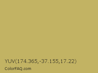 YUV 174.365,-37.155,17.22 Color is a normal yellow color and the nearest color is Laser #c8b568. Hex code #c2b363 and RGB value is rgb(194,179,99). In RGB color space, this color is composed of 76% red, 70% green, 39% blue, In CMYK color space, this color is composed of 0% cyan, 8% magenta, 49% yellow , 24% black , In HSL color space, this color has a hue angle of 51° , 44% saturation and 57% lightness.