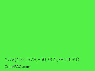 YUV 174.378,-50.965,-80.139 Color is a light green color and the nearest color is Screamin Green #66ff66. Hex code #53f147 and RGB value is rgb(83,241,71). In RGB color space, this color is composed of 33% red, 95% green, 28% blue, In CMYK color space, this color is composed of 66% cyan, 0% magenta, 71% yellow , 5% black , In HSL color space, this color has a hue angle of 116° , 86% saturation and 61% lightness.