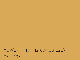 YUV 174.417,-42.604,38.222 Color is a normal orange color and the nearest color is Indian Yellow #e3a857. Hex code #daa958 and RGB value is rgb(218,169,88). In RGB color space, this color is composed of 85% red, 66% green, 35% blue, In CMYK color space, this color is composed of 0% cyan, 22% magenta, 60% yellow , 15% black , In HSL color space, this color has a hue angle of 37° , 64% saturation and 60% lightness.