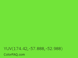 YUV 174.42,-57.888,-52.988 Color is a normal green color and the nearest color is Kiwi #8ee53f. Hex code #72e439 and RGB value is rgb(114,228,57). In RGB color space, this color is composed of 45% red, 89% green, 22% blue, In CMYK color space, this color is composed of 50% cyan, 0% magenta, 75% yellow , 11% black , In HSL color space, this color has a hue angle of 100° , 76% saturation and 56% lightness.